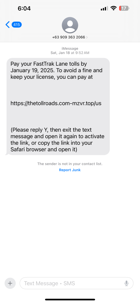 “Pay your FastTrak Lane tolls by January 19, 2025. To avoid a fine and keep your license, you can pay at [sketchy link].”